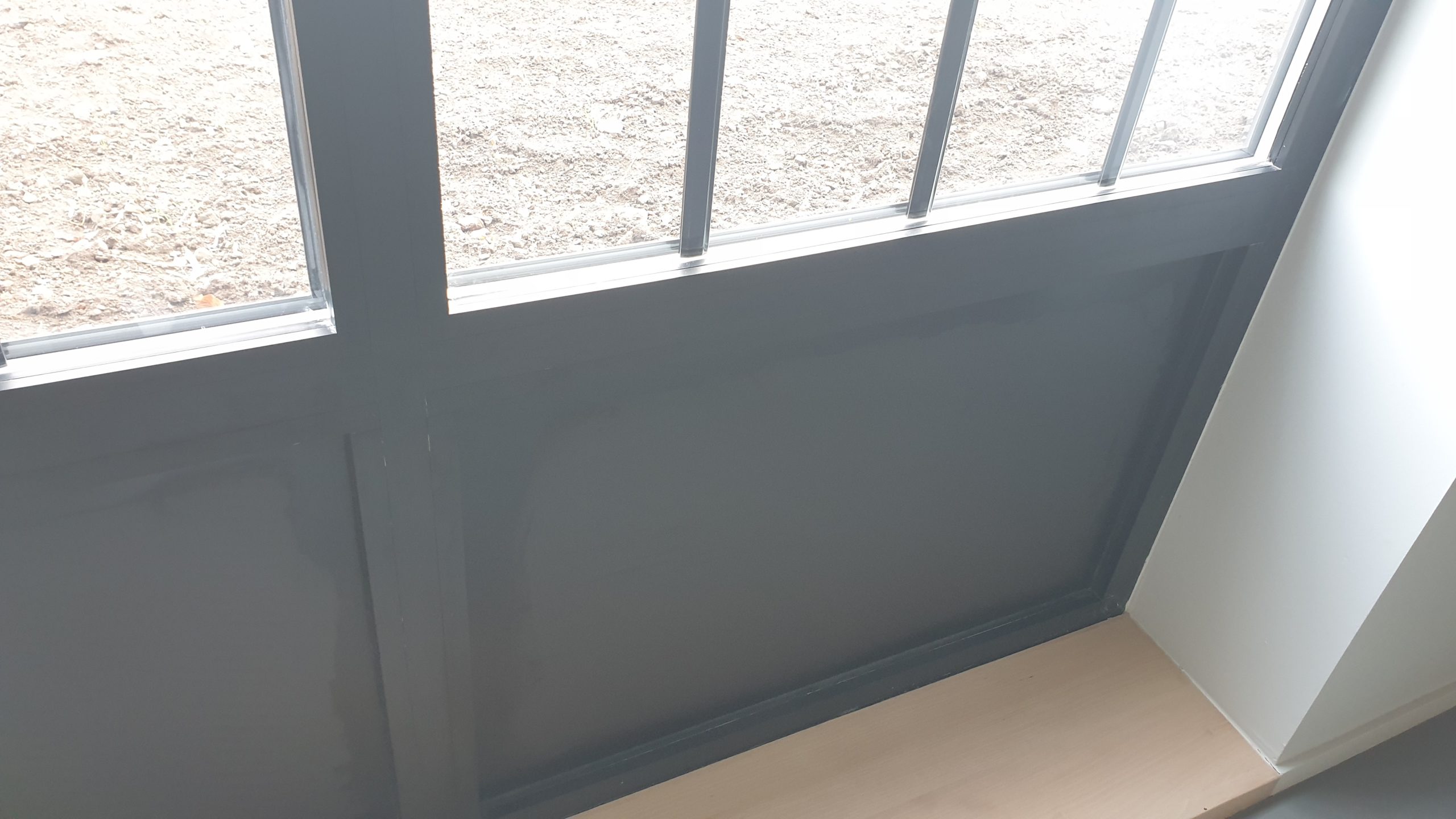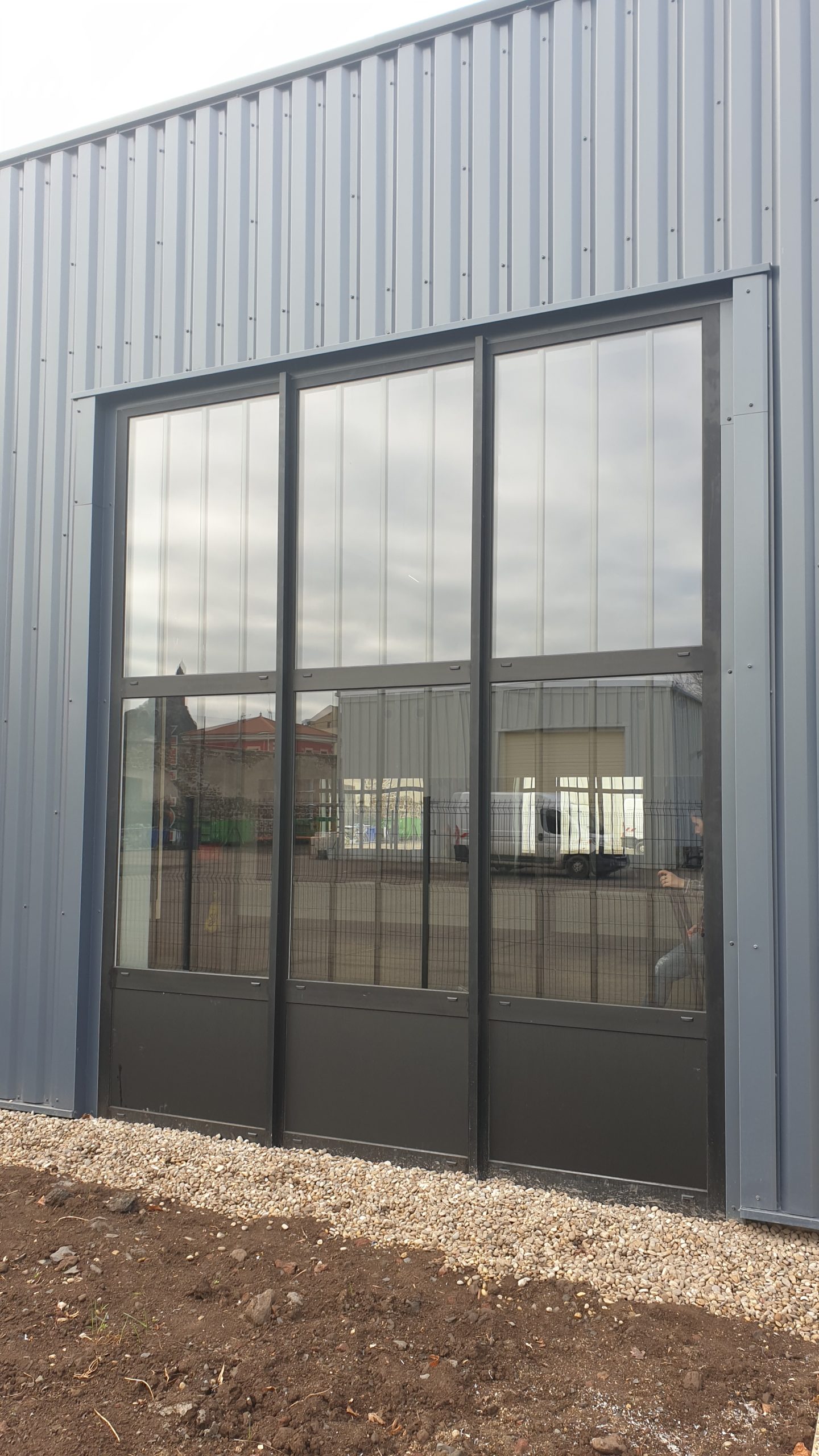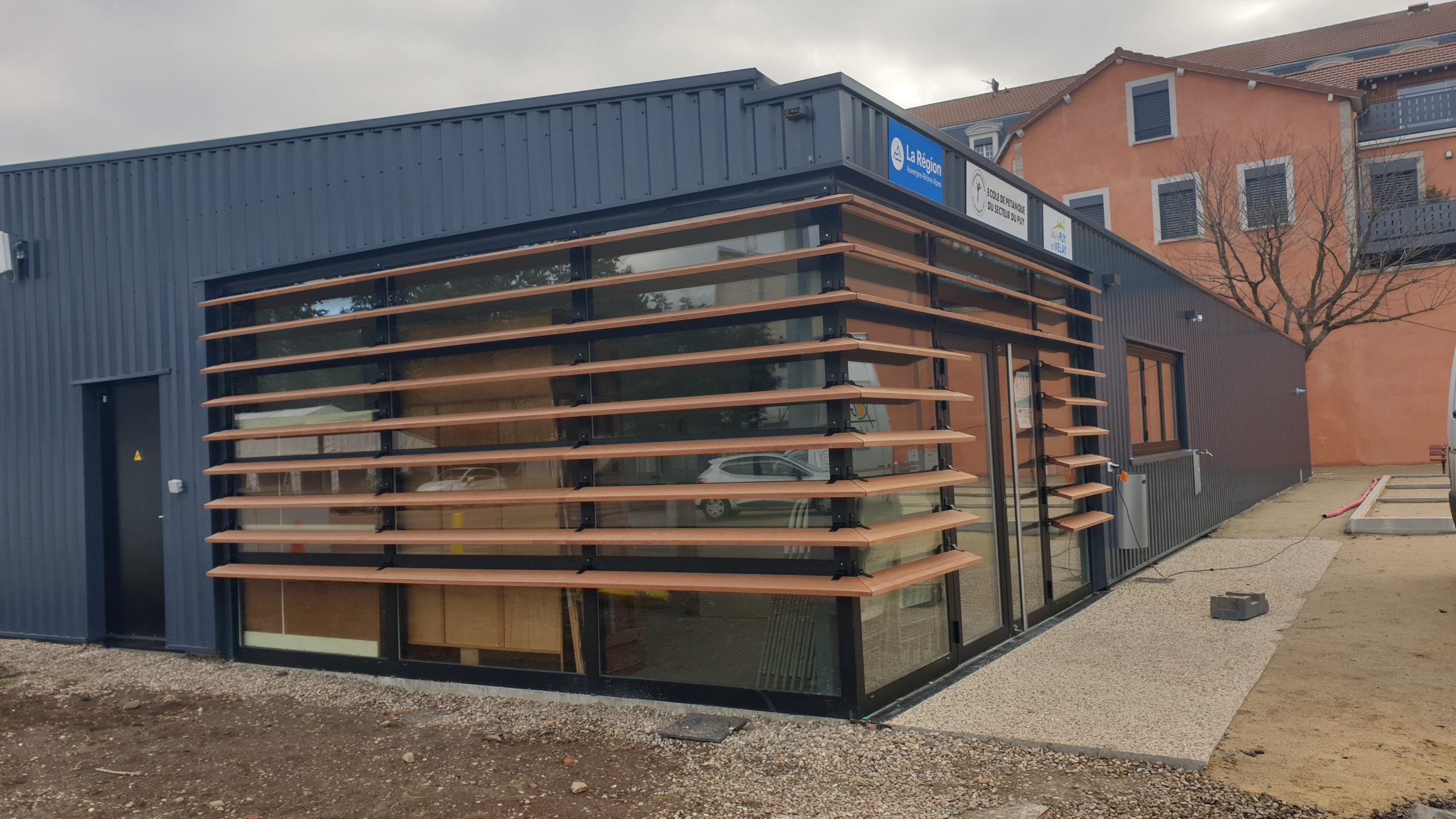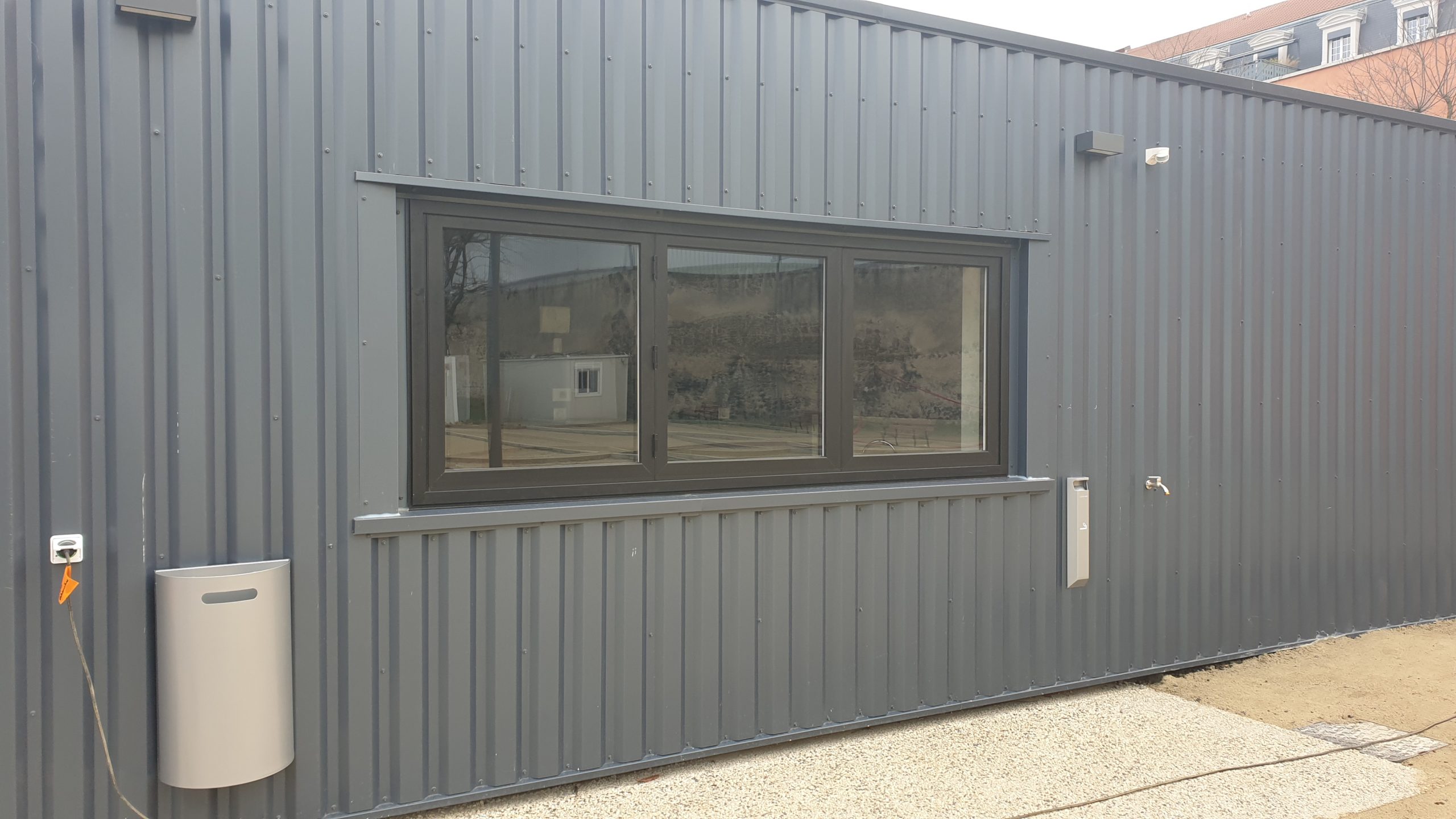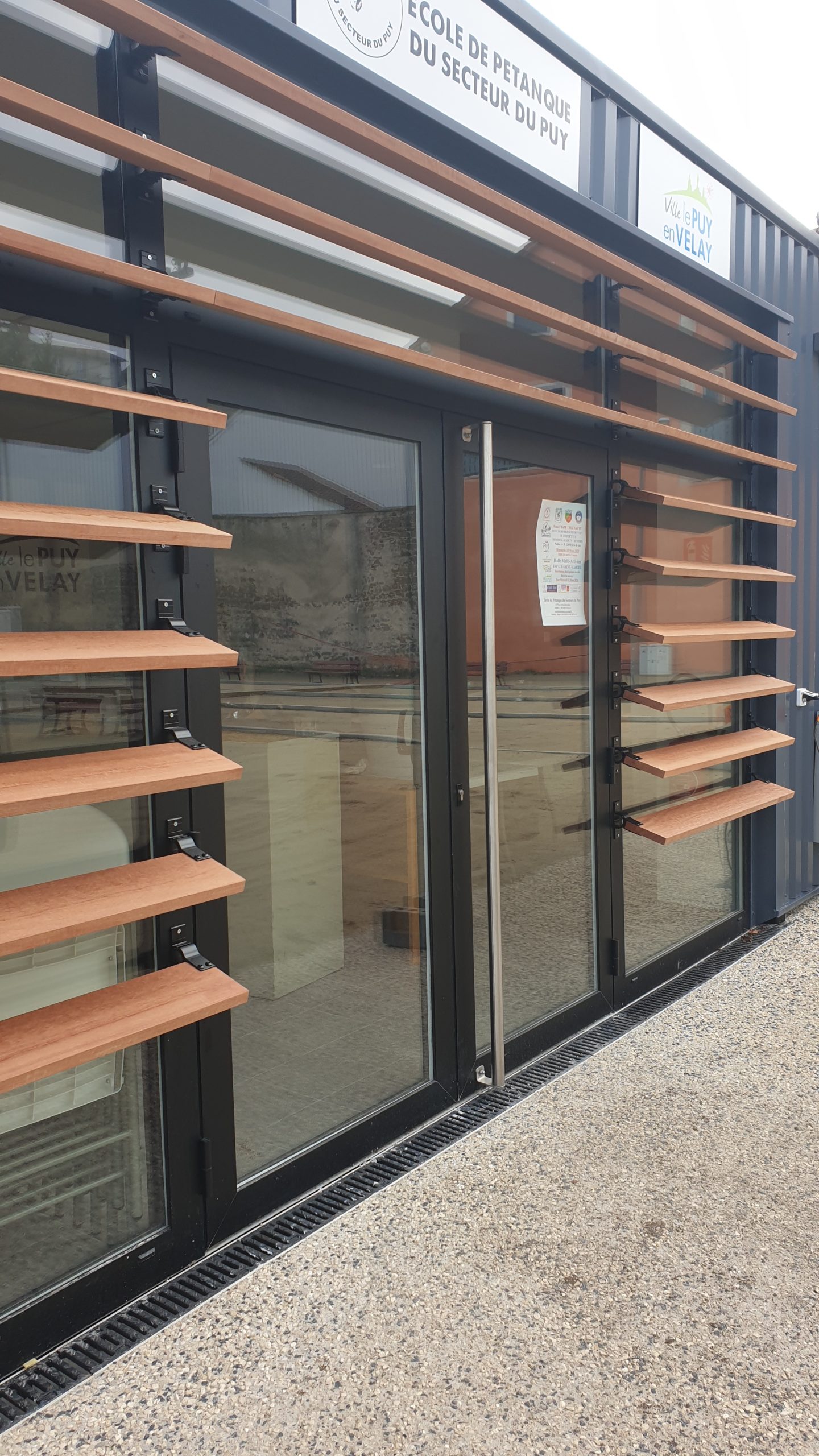 Travaux complets en menuiserie aluminium : habillage extérieur en alu, BSO fixes pour le confort thermique, et aménagement intérieur avec cloisons sanitaires, habillages muraux et châssis vitrés. Un projet alliant fonctionnalité et esthétisme.